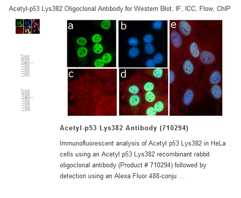 The p53 tumor suppressor protein plays a major role in cellular response to DNA damage and other genomic aberrations. Activation of p53 can lead to either cell cycle arrest and DNA repair, or apoptosis. p53 acetylation at Lys382 is required for recruitment of p300 to the p21 promoter, and is mediated by p300 and CBP acetyltransferases. Acetylation appears to play a positive role in the accumulation of p53 protein in stress responses, and inhibition of deacetylation stabilizes p53.