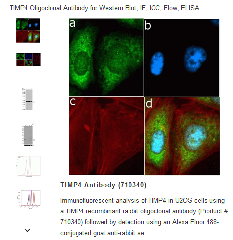 Tissue inhibitor of metalloproteinase 4 (TIMP4) is encoded by the gene TIMP4 located on chromosome 3. It belongs to the family of TIMP genes and is known to inhibit the activity of matrix metalloproteinases. Matrix metalloproteinases (MMP) are a group of proteinases that degrade the components of extracellular matrix. TIMP4 irreversibly binds to MMPs and inactivates them with the help of zinc as a cofactor. The netrin domain of TIMP4 is involved in platelet recruitment and aggregation. Other biological functions include response to cytokine and peptide hormone stimuli and involvement with the ovulation cycle and CNS development