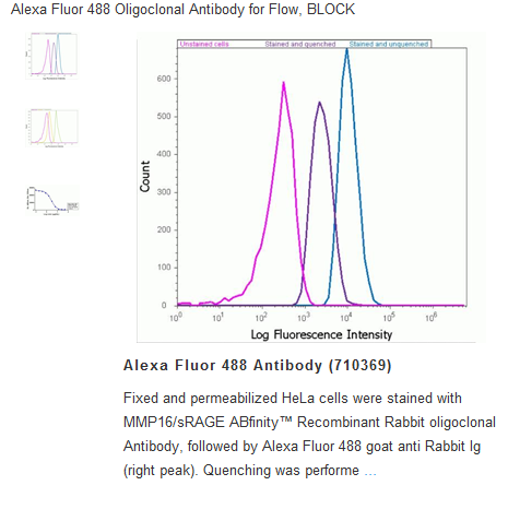 The Alexa Fluor® 488 dye possesses near identical spectral properties and quantum yield to fluorescein isothiocyanate (FITC), but produces brighter, more photostable conjugates. These conjugates are used for imaging and other applications requiring increased sensitivity without being overly impacted by environmental factors. The ABfinity™ Alexa Fluor® 488 Recombinant Rabbit Oligoclonal Antibody has a high affinity for the Alexa Fluor® 488 fluorophore, and quenches most of the fluorescence of the dye upon binding.