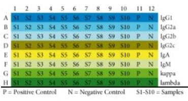 eBioscience Ig Isotyping Kits are the optimal match for screening your hybridoma in a 96-strip well (8x12) ELISA format. Up to 12 individual samples can be tested for anti-IgG1, IgG2a, IgG2b, IgG2c, IgA, and IgM as well as light chain kappa and lambda. To match your individual research needs and budget, choose between the pre-coated (Instant ELISA), a coat-it-yourself (Ready-Set-Go!) isotyping kit.