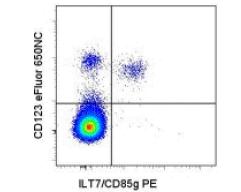 Description: The 6H6 monoclonal antibody reacts with human CD123, the \alpha chain of the IL-3 receptor. This 60-70 kDa transmembrane protein binds to IL-3 with low affinity by itself, and when associated with CD131 (common beta chain) binds IL-3 with high affinity. CD123 is expressed by myeloid precursors, macrophages, dendritic cells, mast cells, basophils, and megakaryocytes.