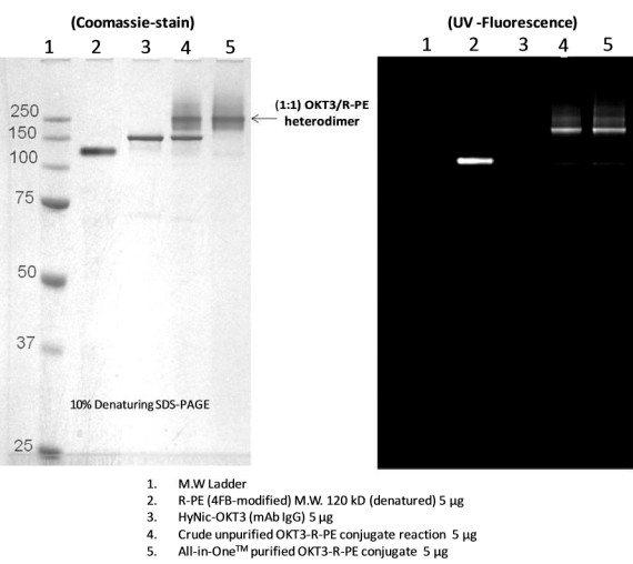 No chromatography required Solulink’s R-PE-Antibody All-in-One Conjugation Kit offers an innovative catalyzed TurboLink™ conjugation based on Solulink’s proprietary linking technology that delivers 100% conversion of antibody to conjugate and novel purification that generates conjugate free of unlabeled antibody or enzyme at a high final yield of >75%, withoutHPLC.The kit includes everything needed to make two direct-labeled R-PE antibody conjugates from 100 µg of any user-supplied antibody.