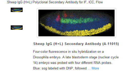 The Alexa Fluor 488 donkey anti—sheep IgG is labeled with our bright, photostable, green-fluorescent Alexa Fluor 488 dye and is prepared from affinity-purified antibodies that react with IgG heavy chains and all classes of immunoglobulin light chains from sheep. To minimize crossreactivity, it has been adsorbed against mouse, rabbit, bovine and human sera and human IgG.