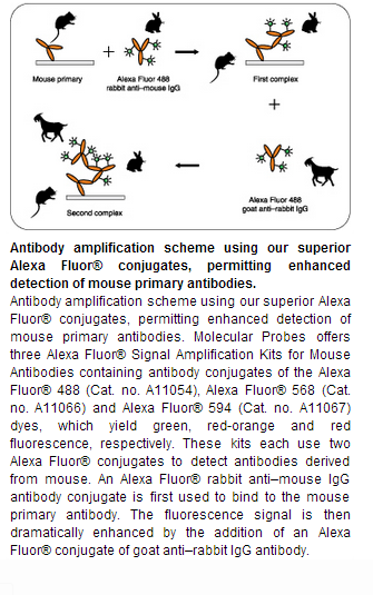 For sensitive detection of mouse primary antibodies, try our Alexa Fluor® 488 Signal-Amplification Kit, which contains Alexa Fluor 488 rabbit anti—mouse IgG and Alexa Fluor 488 goat anti—rabbit IgG conjugates. This kit takes advantage of the intense, photostable fluorescence of Alexa Fluor 488 antibody conjugates and can be used to amplify the signals derived from mouse-derived antibodies. The kit contains a detailed protocol and sufficient reagents for ~60 assays by flow cytometry or imaging. For added convenience, the kit is designed for use with filters and settings appropriate for fluorescein.