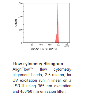 Molecular Probes® AlignFlow™ flow cytometry alignment beads are reliable references for aligning, focusing, and calibrating flow cytometers.The 2.5 µm Alignflow™ Flow Cytometry Alignment Beads for UV Lasers are fluorescent-dye infused microspheres that are optimally excitable between 350-370 nm with emission in the range of 400-470 nm, but that can also be excited by a violet laser.