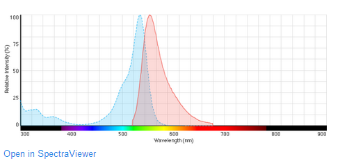 Alexa Fluor 532 carboxylic acid, succinimidyl ester and its conjugates have excitation and emission spectra intermediate between those of the green-fluorescent Alexa Fluor 488 dye and the orange-fluorescent Alexa Fluor 546 dye, making it an ideal dye for use with 532 nm excitation sources, including the frequency-doubled Nd-Yag laser. A 5 mg unit size (A-20101) is also available.