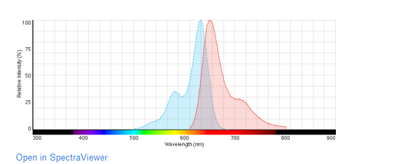 Fluorophore label: Alexa Fluor® 633 dye Reactive group: NHS ester Reactivity: Primary amines on proteins and ligands, amine-modified oligonucleotides Ex/Em of the conjugate: 621/639 nm Extinction coefficient: 159,000 cm-1M-1 Spectrally similar dyes: Cy5® Molecular weight: ~1200