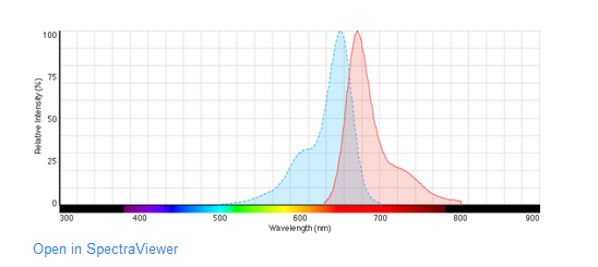 The isomer-free, amine-reactive Alexa Fluor 647 carboxylic acid, succinimidyl ester dye and its conjugates are spectrally identical to the Cy5 dye, with excitation/emission maxima of ~650/668 nm. The Alexa Fluor 647 conjugates, however, are significantly brighter than conjugates prepared with the Cy5 dye. A 5 mg unit size (A-20106) is also available. Fluorescence of this long-wavelength Alexa Fluor dye is not visible to the human eye but is readily detected by most imaging systems.