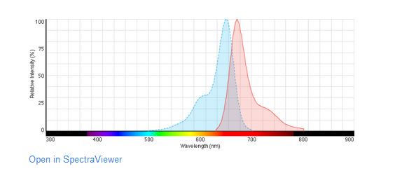 Alexa Fluor 647 单克隆抗体标记试剂盒 (Alexa Fluor 647 Monoclonal Antibody Labeling Kit) 提供一种方便的途径,使用优质 Alexa Fluor 647 染料来标记少量单克隆抗体。 单克隆抗体通常数量较少,这种试剂盒适合用于在每个反应中标记 100 µg。 也可标记相对少量的多克隆抗体或其它蛋白 (>30 kDa)。 若要标记较大量的蛋白 (~1 mg),我们建议用 Alexa Fluor 647 蛋白标记试剂盒 (Alexa Fluor 647 Protein Labeling Kit) (A-20173)。 Alexa Fluor 647 偶联物的光谱与 Cy5 偶联物相同,最大激发/发射波长为 ~650/668 nm。 但 Alexa Fluor 647 偶联物的亮度显著大于用 Cy5 染料制备的偶联物。 长波长 Alexa Fluor 染料的荧光肉眼不可见,但可用大多数成像系统轻松检测。