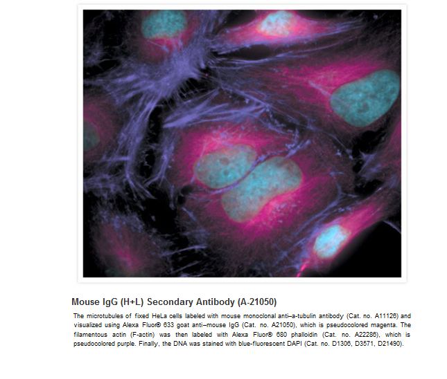 To minimize cross-reactivity, these goat anti-mouse IgG (H+L) whole secondary antibodies have been affinity purified and cross-adsorbed against human IgG and human serum prior to conjugation. Cross-adsorption or pre-adsorption is a purification step to increase specificity of the antibody resulting in higher sensitivity and less background staining. The secondary antibody solution is passed through a column matrix containing immobilized serum proteins from potentially cross-reactive species. Only the nonspecific-binding secondary antibodies are captured in the column, and the highly specific secondaries flow through. The benefits of this extra step are apparent in multiplexing/multicolor-staining experiments (e.g., flow cytometry) where there is potential cross-reactivity with other primary antibodies or in tissue/cell fluorescent staining experiments where there are may be the presence of endogenous immunoglobulins.