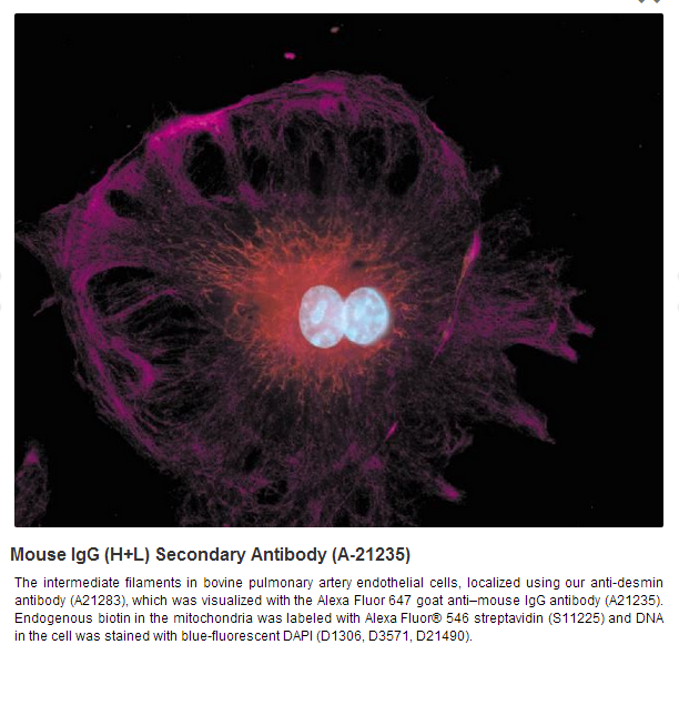 To minimize cross-reactivity, these goat anti-mouse IgG (H+L) whole secondary antibodies have been affinity purified and cross-adsorbed against human IgG and human serum prior to conjugation. Cross-adsorption or pre-adsorption is a purification step to increase specificity of the antibody resulting in higher sensitivity and less background staining. The secondary antibody solution is passed through a column matrix containing immobilized serum proteins from potentially cross-reactive species. Only the nonspecific-binding secondary antibodies are captured in the column, and the highly specific secondaries flow through. The benefits of this extra step are apparent in multiplexing/multicolor-staining experiments (e.g., flow cytometry) where there is potential cross-reactivity with other primary antibodies or in tissue/cell fluorescent staining experiments where there are may be the presence of endogenous immunoglobulins.