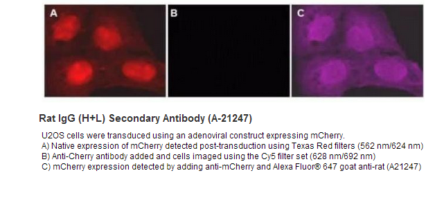 To minimize cross-reactivity, these goat anti-rat IgG (H+L) whole secondary antibodies have been affinity purified and cross-adsorbed against mouse IgG, mouse serum, and human serum. Cross-adsorption or pre-adsorption is a purification step to increase specificity of the antibody resulting in higher sensitivity and less background staining. The secondary antibody solution is passed through a column matrix containing immobilized serum proteins from potentially cross-reactive species. Only the nonspecific-binding secondary antibodies are captured in the column, and the highly specific secondaries flow through. The benefits of this extra step are apparent in multiplexing/multicolor-staining experiments (e.g., flow cytometry) where there is potential cross-reactivity with other primary antibodies or in tissue/cell fluorescent staining experiments where there are may be the presence of endogenous immunoglobulins.