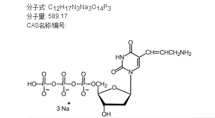 The amine-modified deoxyuridine 5'-triphosphate, aminoallyl-dUTP, can be used to produce amine-modified DNA by conventional enzymatic incorporation methods such as reverse transcription, nick translation, random primed labeling, or PCR. The amine-modified DNA that results can then be labeled with any amine-reactive dye or hapten. This two-step technique consistently results in a high degree of uniform DNA labeling that is difficult to obtain by other methods. Molecular Probes also provides a wide variety of amine-reactive reagents for labeling amine-modified DNA, including succinimidyl esters of our Alexa Fluor® dyes, conventional fluorescent dyes, biotin, and dinitrophenyl (DNP). Aminoallyl dUTP is also available in a 50 mM concentration (A32764), and aminoallyl dUTP, along with appropriate buffers, solvents and pre-measured amine-reactive dyes, is available in our convenient ARES™ DNA Labeling Kits.
