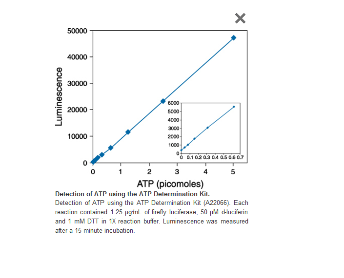 Molecular Probes' ATP Determination Kit offers a convenient bioluminescence assay for quantitative determination of ATP with recombinant firefly luciferase and its substrate D-luciferin. The assay is based on luciferase's requirement for ATP in producing light.