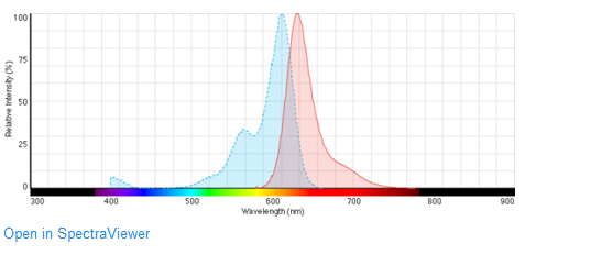 The amine-reactive Alexa Fluor® 610-X, succinimidyl ester and its conjugates yield bright red-fluorescence unmatched by any other spectrally similar dye. The Alexa Fluor® 610-X dye is a bright and photostable Texas Red® dye substitute and produces conjugates with excitation/emission maxima of ~612/628 nm.