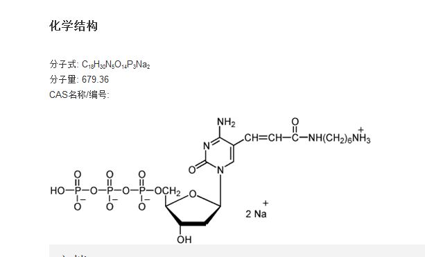 Aha-dCTP (5-aminohexylacrylamido-dCTP) is modified at the C-5 position of cytosine with a unique hexylacrylamide moiety. aha-dCTP can be used to produce amine-modified DNA by conventional enzymatic incorporation methods such as reverse transcription. The amine-modified DNA can then be labeled with any amine-reactive dye to generate labeled nucleic acid hybridization probes. This two-step labeling technique consistently results in a uniform and high degree of DNA labeling that is difficult to obtain by other methods. In addition to this 2 mM solution in TE (500 µL unit size), it is available as a 50 mM solution in TE (50 µL unit size, Catlog number: A32769).