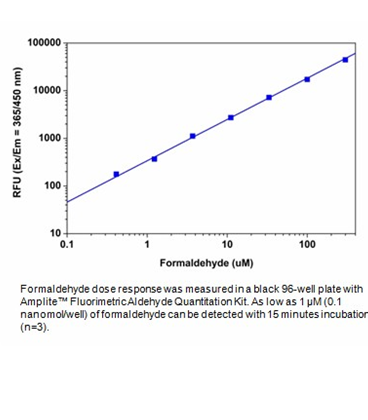 The formation, reactivity and toxicity of aldehydes originating from the peroxidation of lipids of cellular membranes have received great attention in recent years. Rapid and accurate measurement of aldehydes is an important task for biological research, chemical research, food industry and environmental pollution surveillance. There are a few reagents or assay kits available for quantifying the number of aldehydes. Most of the existing aldehyde test methods are based on separations either by the tedious and expensive HPLC-MS or GC-MS. Both our Amplite Colorimetric Aldehyde Qutitation Kit (10051) and Amplite Fluorimetric Aldehyde Qutitation kit (10052) are used for quantifying aldehydes at higher pH. Kit 10052 uses a proprietary fluorogenic dye that generates a strongly fluorescent product upon reacting with an aldehyde. Kit 10052 is much more sensitive than Kit 10051. This fluorimetric kit provides a sensitive mix-and-read method to detect as little as 0.1 nanomole of aldehyde in a 100 assay volume (1 ). The assay can be performed in a convenient 96-well or 384-well microtiter-plate format and easily adapted to automation without a separation step. Its signal can be easily read by a fluorescence microplate reader at Ex/Em = 365/435 nm.