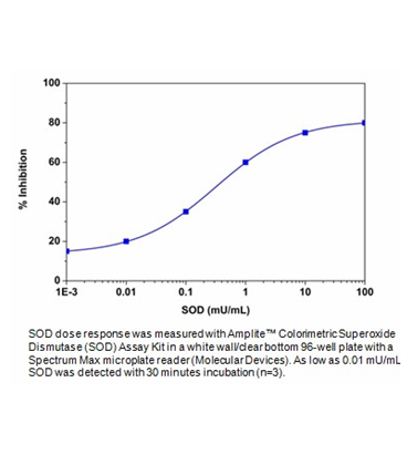 The Amplite. Colorimetric Superoxide Dismutases Assay Kit provides a quick and sensitive colorimetric method for measureing SOD. As shown belwo, xanthine is converted to superoxide radical ions (O2-·), uric acid and hydrogen peroxide by xanthine oxidase (XO). Superoxide reacts with ReadiView. SOD560 to generate a color product that absorbs around 560 nm. SOD competes the reaction of ReadiView. SOD 560 with superoxide, thus reduce the absorption at 560 nm. The reduction in the absoption of ReadiView. SOD 560 at 560 nm is proportional to SOD activity. The kit can be performed in a convenient 96-well or 384-well microtiter-plate format and easily adapted to automation without a separation step.