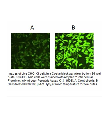 This Amplite™ Intracellular Fluorimetric Hydrogen Peroxide Assay Kit uses our unique ROS Green™ hydrogen peroxide sensor to quantify hydrogen peroxide in live cells. ROS Green™ is cell-permeable, and generates the green fluorescence when it reacts with hydrogen peroxide. The kit is an optimized “mix and read” assay format that is compatible with HTS liquid handling instruments. The Amplite™ Intracellular Fluorimetric Hydrogen Peroxide Assay Kit provides a sensitive, one-step fluorometric assay to detect as little as 0.3 nanomoles of H2O2 in a 100 μL assay volume (3 μM). The assay can be performed in a convenient 96-well or 384-well microtiter-plate format. Its signal can be easily read by either a fluorescence microplate reader at Ex/Em = 490/520 nm for H2O2 detection in solution or a fluorescence microscopy for live cell H2O2 imaging.