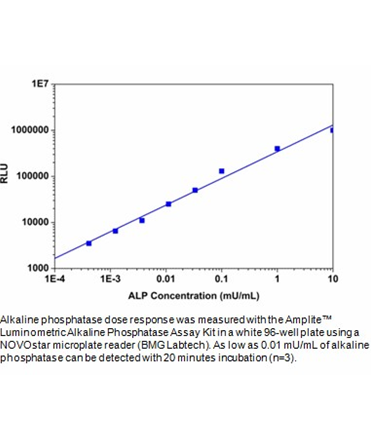 Alkaline phosphatase is a highly sensitive enzyme for ELISA, immuno-histochemical, Northern, Southern and Western blot applications. It is widely used in various biological assays (in particular, immunoassays) and ELISA-based diagnostics. This Amplite™ Alkaline Phosphatase Assay Kit uses a proprietary luminogenic phosphatase substrate, to quantify alkaline phosphatase activity in solutions as well as in cell extracts. This proprietary phosphatase substrate generates a luminescent product that produces strong luminescence upon interaction with phosphatase. The kit provides all the essential components with our optimized ‘mix and read’ assay protocol that is compatible with HTS liquid handling instruments. It has extremely high sensitivity, and can be used for the assays that require demanding sensitivity.