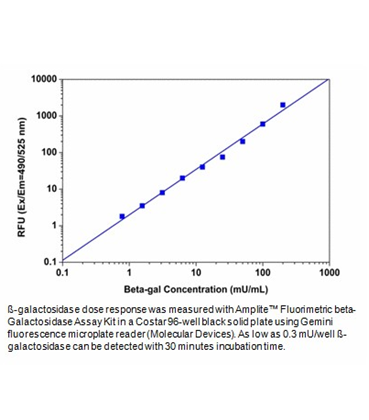 E. coli beta-galactosidase is a 464 kD tetramer. Each unit of beta-galactosidase consists of five domains, the third of which is the active site. It is an essential enzyme in cells. Deficiencies in this enzyme can result in galactosialidosis or Morquio B syndrome. In E. coli, beta-galactosidase is produced by the activation of LacZ operon. Detection of LacZ expression has become routine to the point of detection of as few as 5 copies of ?-galactosidase per cell. This kit uses a fluorogenic galactosidase substrate that can sensitively distinguish LacZ+ vs. LacZ-cells. It can be used either for detecting galactosidase conjugates in ELISA type assay systems or for monitoring LacZ gene expression in cells. The galactosidase-cleaved product has Ex/Em = 490/520 nm that can be detected with most of fluorescence instruments equipped with a FITC filter set.