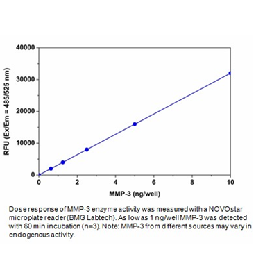 The matrix metalloproteinases (MMPs) constitute a family of zinc-dependent endopeptidases that function within the extracellular matrix. These enzymes are responsible for the breakdown of connective tissues and are important in bone remodeling, the menstrual cycle and repair of tissue damage. While the exact contribution of MMPs to certain pathological processes is difficult to assess, MMPs appear to play a key role in the development of arthritis as well as in the invasion and metastasis of cancer. MMPs tend to have multiple substrates, with most family members having the ability to degrade different types of collagen along with elastin, gelatin and fibronectin. It is quite difficult to find a substrate that is selective to a single MMP enzyme. This FRET substrate is designed to have a relative high selectivity to MMP-3. It is used to monitor the MMP-3 activity. It can also be used to screening MMP-3 inhibitors when a purified MMP-3 enzyme is used. This FRET substrate is based on our TF2/TQ2 FRET pair. Upon MMP-3 hydrolysis the fluorescence of MMP-3 Green™ FRET peptide substrate is increased since the TF2/TQ2 FRET pair is separated. The fluorescence increase is proportional to the MMP-3 enzyme activities.