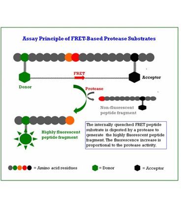 The matrix metalloproteinases (MMPs) constitute a family of zinc-dependent endopeptidases that function within the extracellular matrix. These enzymes are responsible for the breakdown of connective tissues and are important in bone remodeling, the menstrual cycle and repair of tissue damage. While the exact contribution of MMPs to certain pathological processes is difficult to assess, MMPs appear to play a key role in the development of arthritis as well as in the invasion and metastasis of cancer. MMPs tend to have multiple substrates, with most family members having the ability to degrade different types of collagen along with elastin, gelatin and fibronectin. It is quite difficult to find a substrate that is selective to a single MMP enzyme. This FRET substrate is designed to have a relative high selectivity to MMP-3. It is used to monitor the MMP-3 activity. It can also be used to screening MMP-3 inhibitors when a purified MMP-3 enzyme is used. This FRET substrate is based on our TF2/TQ2 FRET pair. Upon MMP-3 hydrolysis the fluorescence of MMP-3 Green™ FRET peptide substrate is increased since the TF2/TQ2 FRET pair is separated. The fluorescence increase is proportional to the MMP-3 enzyme activities.