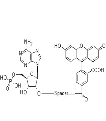 AMP-Fluorescein conjugate calibrator is desigend to use with our green fluorescent FAM-cAMP PDE IV substrate, a cAMP derivative that is a specific substrate for phosphodiesterase (PDE) IV (#Cat: 13602). This AMP-Fluorescein conjugate calibrator is the hydrolyzed product of FAM-cAMP PDE IV substrate (#Cat: 13602) by PDE IV. It is used to calibrate the hydrolysis rate of FAM-cAMP PDE IV substrate (#Cat: 13602) by PDE IV.