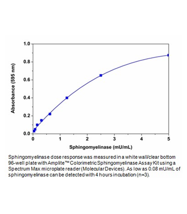 Sphingomyelinase (SMase) is an enzyme that is responsible for cleaving sphingomyelin (SM) to phosphocholine and ceramide. Activation of SMases in cells plays an important role in the cellular responses. Five types of sphingomyelinase (SMase) have been identified based on their cation dependence and pH optima of action. They are lysosomal acid SMase, secreted zinc-dependent acid SMase, magnesium-dependent neutral SMase, magnesium-independent neutral SMase, and alkaline SMase. Among the five types, the lysosomal acidic SMase and the magnesium-dependent neutral SMase are considered major candidates for the production of ceramide in the cellular response to stress. Our Amplite™ Colorimetric Sphingomyelinase Assay Kit provides a sensitive method for detecting neutral SMase activity or screening its inhibitors. The kit uses Amplite™ Blue as a colorimetric probe to indirectly quantify the phosphocholine produced from the hydrolysis of sphingomyelin (SM) by sphingomyelinase (SMase). It can be used for measuring the SMase activity in blood, cell extracts or other solutions. The absorbance of light at 655 nm is proportional to the formation of phosphocholine, therefore to the SMase activity. The kit is an optimized “mix and read” assay that is compatible with HTS liquid handling instruments.