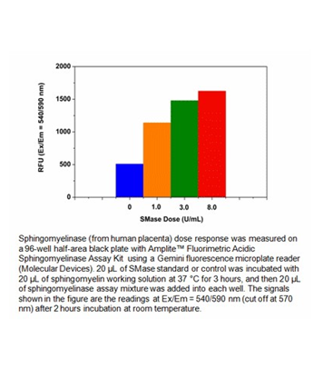 Sphingomyelinase (SMase) is an enzyme that is responsible for cleaving sphingomyelin (SM) to phosphocholine and ceramide. Activation of SMases plays an important role in the cellular response such as regulation of cell growth, cell differentiation, cell cycle arrest and programmed cell death. Five types of sphingomyelinase (SMase) have been identified based on their cation dependence and pH optima of action, including lysosomal acid SMase, secreted zinc-dependent acid SMase, magnesium-dependent neutral SMase, magnesium-independent neutral SMase and alkaline SMase. Among them, the lysosomal acidic SMase and the magnesium-dependent neutral SMase are considered to be the major factors for the production of ceramide in cellular stress responses. Our Amplite™ Fluorimetric Acidic Sphingomyelinase Assay Kit provides one of the most sensitive methods for detecting acidic SMase activity or screening its inhibitors. The kit uses Amplite™ Red as a fluorogenic probe to indirectly quantify the phosphocholine produced from the hydrolysis of sphingomyelin (SM) by sphingomyelinase (SMase). It can be used for measuring the SMase activity in blood, cell extracts or other solutions. The fluorescence intensity of Amplite™ Red is proportional to the formation of phosphocholine, therefore to the SMase activity. The kit is an optimized “mix and read” assay compatible with HTS liquid handling instruments.