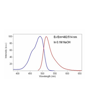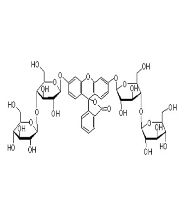 This non-fluorescent fluorescein substrate generates the bright fluorescein product that has Ex/Em = 492/514 nm, and can be easily detected with a FITC filter set. In general, fluorescein substrates are much more sensitive than coumarin or nitrophenol-based substrates. This fluorescein substrate is used for monitoring cellulase activities. Cellulases are a family of enzymes that include ß-glucosidases, endoglucanases and exoglucanases. These enzymes cleave the ß-1,4-D-glycosidic bonds that link the glucose units comprising cellulose. In addition to being produced by plants, cellulase activity is found in many fungi and bacteria, including some plant pathogens. Most animal cells are not known to produce cellulase, in which the cellulolytic activity is often carried out by symbionts. The study of cellulase activity has many applications in plant molecular biology, agriculture, and manufacturing. Cellulase is becoming important in the development of alternative fuel sources, as glucose obtained from cellulose hydrolysis is easily fermented into ethanol. Activity of most cellulases can be conveniently monitored using this sensitive fluorescein cellobioside. Upon cleavage, the fluorescent compound, fluorescein, is released and activity measurements are easily obtained in a microtiter plate based assay format.
