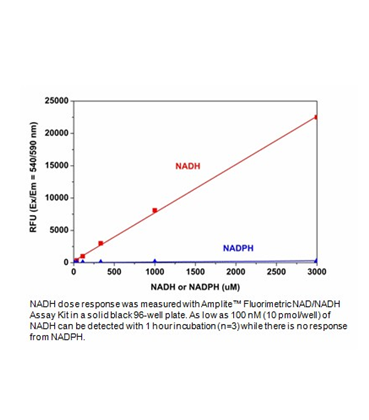 Nicotinamide adenine dinucleotide (NAD+) and nicotinamide adenine dinucleotide phosphate (NADP+) are two important cofactors found in cells. NADH is the reduced form of NAD+, and NAD+ is the oxidized form of NADH. It forms NADP with the addition of a phosphate group to the 2' position of the adenyl nucleotide through an ester linkage. NADP is used in anabolic biological reactions, such as fatty acid and nucleic acid synthesis, which require NADPH as a reducing agent. In chloroplasts, NADP is an oxidizing agent important in the preliminary reactions of photosynthesis. The NADPH produced by photosynthesis is then used as reducing power for the biosynthetic reactions in the Calvin cycle of photosynthesis. The traditional NAD/NADH and NADP/NADPH assays are done by monitoring of NADH or NADPH absorption at 340 nm. This method suffers low sensitivity and high interference since the assay is done in the UV range that requires expensive quartz microplate. This Amplite™ NAD/NADH Assay Kit provides a convenient method for sensitive detection of NAD, NADH and their ratio. The enzymes in the system specifically recognize NAD/NADH in an enzyme cycling reaction. There is no need to purify NAD/NADH from sample mix. The enzyme cycling reaction significantly increases detection sensitivity. In addition, this assay has very low background since it is run in the red visible range that significantly reduces the interference from biological samples. The assay has demonstrated high sensitivity and low interference with 570 nm excitation 590 nm emission.