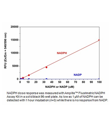 Nicotinamide adenine dinucleotide (NAD+) and nicotinamide adenine dinucleotide phosphate (NADP+) are two important cofactors found in cells. NADH is the reduced form of NAD+, and NAD+ is the oxidized form of NADH. It forms NADP with the addition of a phosphate group to the 2' position of the adenyl nucleotide through an ester linkage. NADP is used in anabolic biological reactions, such as fatty acid and nucleic acid synthesis, which require NADPH as a reducing agent. In chloroplasts, NADP is an oxidizing agent important in the preliminary reactions of photosynthesis. The NADPH produced by photosynthesis is then used as reducing power for the biosynthetic reactions in the Calvin cycle of photosynthesis. The traditional NAD/NADH and NADP/NADPH assays are done by monitoring of NADH or NADPH absorption at 340 nm. This method suffers low sensitivity and high interference since the assay is done in the UV range that requires expensive quartz microplate. This Amplite™ NADPH Assay Kit provides a convenient method for sensitive detection of NADPH. The enzymes in the system specifically recognize NADPH in an enzyme cycling reaction. The enzyme cycling reaction significantly increases detection sensitivity.