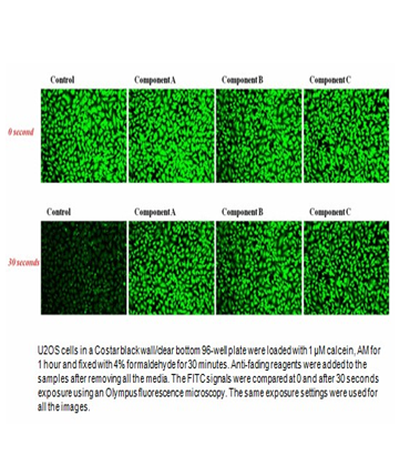 When exposed to excitation light, fluorescence intensity of dyes decreases due to their photooxidation or other photoreactions. There are very few fluorescent dyes that completely resist photobleaching. Frequently, when a section has been scanned repeatedly under strong excitation light, dyes could lose significant fluorescence signal before visual evaluation or photography can be accomplished. For examples, the photobleaching of fluoresceins (such as FITC-labeled antibodies) has become a major problem in fluorescence microscopy. In severe cases (such as phycoprotein-labeled bioconjugates), a fluorescence image of high resolution can not even be taken due to the extremely high photobleaching rate. Signal Guard™ Anti-Fading Kit is to reduce the dye photobleaching rate, giving researchers longer observation time. The kit contains all the essential components that can be readily applied to imaging experiments. They are all premixed and ready-to-use solutions. This kit is designed for slide format while #20003 is designed for microplate format.