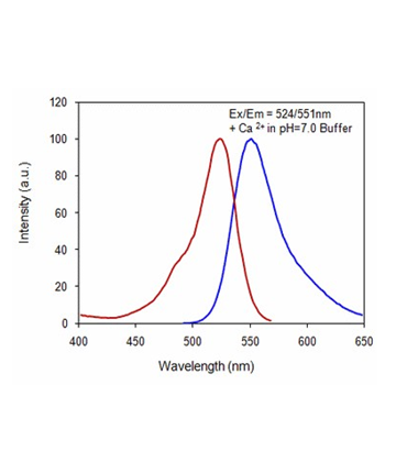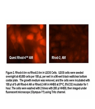 Calcium measurement is critical for numerous biological investigations. Fluorescent probes that show spectral responses upon binding Ca2+ have enabled researchers to investigate changes in intracellular free Ca2+ concentrations by using fluorescence microscopy, flow cytometry, fluorescence spectroscopy and fluorescence microplate readers. Rhod-2 is most commonly used among the red fluorescent calcium indicators. However, Rhod-2 AM is only moderately fluorescent in live cells upon esterase hydrolysis, and has very small cellular calcium responses. Quest Rhod-4™ has been developed to improve Rhod-2 cell loading and calcium response while maintaining the spectral wavelength of Rhod-2. In CHO and HEK cells Quest Rhod-4™ AM has cellular calcium response that is 10 times more sensitive than Rhod-2 AM. AAT Bioquest offers versatile packing sizes of Quest Rhod-4 to meet your special needs, e.g., 1 mg; 10x50 µg; 20x50 µg; HTS packages with no additional packaging charge.