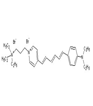 MM 4-64 is the abbreviation of our Membrane Marker 4-64, chemically called N-(3-triethylammoniumpropyl)-4-(6-(4-(diethylamino)phenyl)hexatrienyl)pyridinium dibromide. In literature this membrane marker is also called FM 4-64 (FM® is the trademark of Molecular Probes). It is a lipophilic styryl dye that is used as a vital stain to follow bulk membrane-internalization and transport to the vacuole in yeast. MM 4-64 is a sensitive reporter of vacuolar dynamics, detecting such events as segregation structure formation during mitosis, vacuole fission/fusion events, and vacuolar morphology in different classes of vacuolar protein sorting mutants. It can be used for detecting endosome to vacuole membrane transport in vitro.