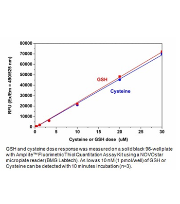 Thiolite™ Green is one of the most sensitive sensors for measuring thiol compounds. It gives a green fluorescent adduct upon reacting with thiol compounds (such as cysteine). It can be used to quantifying the number of cysteines on a protein. We have used it to measure glutathione fluorimetrically. It has >200-fold fluorescence enhancement upon reaction with thiol-containing compounds.