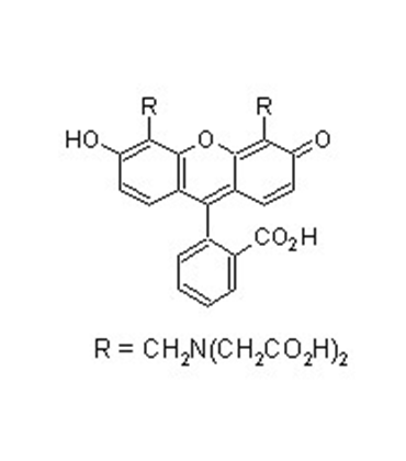 Calcein, also known as fluorexon, fluorescein complex, is a fluorescent calcium indicator with an excitation and emission wavelengths of 495 and 515nm respectively. Calcein self-quenches at concentrations above 100 mM. It is used as a complexometric indicator for titration of calcium ions with EDTA, and for fluorimetric determination of calcium. It is slightly soluble in water. The proton dissociation constants are reported to be pKa1=2.1, pKa2=2.9, pKa3=4.2, pKa4=5.5, pKa5=10.8 and pKa6=11.7. Calcein solution emits a yellowish-green fluorescence in acidic conditions, and no fluorescence in basic conditions. However, calcein emits fluorescence in the presence of metal ions such as Al, Ba, Cu, Mg and Zn in basic conditions. Therefore, calcein can also be used for direct fluorimetric titration of these heavy metal ions besides Ca.