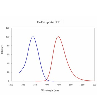 TF1 is designed to be a superior fluorophore alternative to EDANS. TF1 has (a). much stronger absorption; (b). much stronger fluorescence intensity; and (3). much less environment-sensitive fluorescence. Additionally their fluorescence is pH-independent from pH 3 to 11. These characteristics make this new dye family a superior alternative to EDANS. TF1-labeled peptides and nucleotides exhibit much stronger fluorescence and higher sensitivity than the ones labeled with EDANS. In pairing with our Tide Quencher™ 1 (TQ1), a variety of FRET peptides and nucleotides can be developed for detecting proteases and molecular beacons with enhanced sensitivity and stability.
