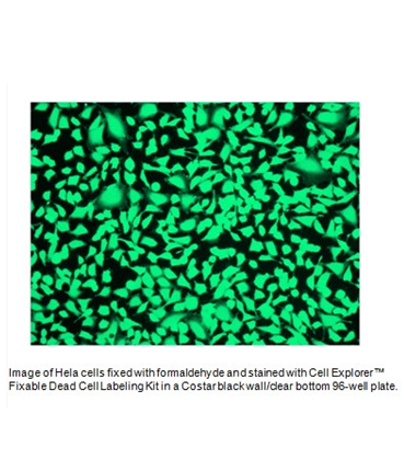 Our Cell Explorer™ fluorescence imaging kits are a set of tools for labeling cells for fluorescence microscopic investigations of cellular functions. The effective labeling of cells provides a powerful method for studying cellular events in a spatial and temporal context. This particular kit is designed to uniformly label fixed mammalian cells in green fluorescence for flow cytometry applications with violet laser excitation. The kit uses a proprietary green fluorescent dye that is more fluorescent upon bonding to cellular components. The fluorescent dye used in the kit is well excited with the violet laser (405 nm excitation) to fluorescence at 510 nm. The kit provides all the essential components with an optimized cell-labeling protocol. It is an excellent tool for preserving of fluorescent images of particular cells, and can also be used for fluorescence flow cytometry applications.