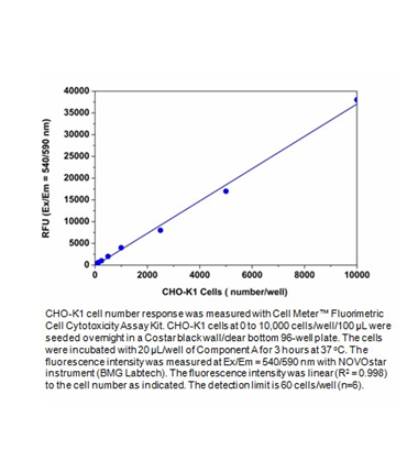 Our Cell Meter™ assay kits are a set of tools for monitoring cell viability. There are a variety of parameters that can be used for monitoring cell viability. The measurement of mitochondrial dehydrogenases (e.g. LDH) activity is a well-accepted assay to quantify cell numbers and monitor cell viability. This cell viability assay kit provides a fast, simple, accurate and homogeneous assay for the fluorometric detection of viable cells. This assay is based on the observation that blue and non-fluorescent resazurin is reduced to a pink fluorescent dye (resorufin) by accepting the electron from mitochondrial respiratory chain in live cells. The amount of resorufin produced is directly proportional to the number of living cells. The detection sensitivity of cell proliferation and cytotoxicity assays using this kit is higher than other assays such as MTT. Since the kit components are quite stable with minimal cytotoxicity, a longer incubation (such as 24 to 48 hours) is possible. The assay can be performed in a convenient 96-well and 384-well microtiter-plate format. The characteristics of its high sensitivity (<100 CHO cells), non-radioactive and no-wash method made the kit suitable for high throughput screening of cell proliferation or cytotoxicity against a variety of compounds and adaptable for a wide variety of instrument platforms. The kit provides all the essential components with an optimized assay protocol. It is suitable for proliferating and non-proliferating cells, and can be used for both suspension and adherent cells. Using 20 ul of reagents per well in a 96-well format, this kit provides sufficient reagents to perform 1000 assays. Using 10 ul of reagents per well in a 384-well format, this kit provides sufficient reagents to perform 2,000 assays.