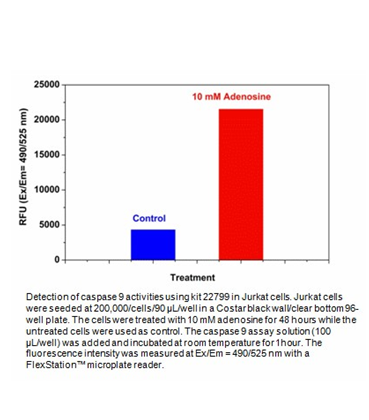 Our Cell Meter™ assay kits are a set of tools for monitoring cellular functions. There are a variety of parameters that can be used. This particular kit is designed to monitor cell apoptosis by measuring caspase 9 activity. Caspase 9 is a member of the CED-3 subfamily. Activated Caspase-9 cleaves downstream caspases such as caspase-3, -6 and -7, initiating the caspase cascade. It is essential for apoptosis during normal development of the central nervous system. Caspase 9 is proven to have selectivity for the peptide sequence Leu-Glu-His-Asp (LEHD). This kit uses (Ac-LEHD)2-R110 as a fluorogenic indicator for caspase 9 activity. Cleavage of R110 peptides by caspase 9 generates strongly fluorescent rhodamine 110 (R110)which is monitored at the emission between 520 nm and 530 nm with the excitation between 480 nm and 500 nm. The kit provides all the essential components. The assay is robust and can be readily adapted for high throughput screening. It can be used to either quantify the activated caspase 9 activities in apoptotic cells or screen the caspase 9 inhibitors. Quite a few labs have used this kit for high throughput screenings.