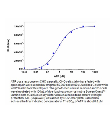 Screen Quest检测试剂盒是一类用于检测各种细胞离子通道以及电位等系列工具,包括膜电位、钙离子流、多药物抗性、氯离子以及氯离子通道等方面的指标。每种检测方案均能提供不同的检测方案。这些高效的检测方案为从多角度研究细胞功能活动提供了一种十分有效的方法。而钙离子流的检测是药物研发中筛选G蛋白偶联受体(GPCR)的首选方法。Screen Quest钙离子发光法检测试剂盒用一种钙离子高灵敏的、膜渗透性的腔肠素类似物作为转染了原水母发光蛋白基因细胞中钙离子指示剂。水母素是来自Aequorea victoria水母的一种钙离子敏感型生物发光蛋白,它已经被用作细胞中钙离子指示剂。当它与钙离子结合时,这种水母素复合物发射蓝光,发光的强度与Ca2+成直接的比例关系。我们的腔肠素检测试剂盒比基于荧光的钙离子检测试剂盒(例如:Fluo-4, Fluo-3, Calcium-3和Calcium-4)灵敏度更高。这种试剂盒为检测G-蛋白偶联受体(GPCRs)和钙离子通道提供了最佳方法。这种检测法可以便捷地用于96或384微孔板分析,并且易于实现自动化。它可能在一个所给的特定环境中监测细胞内钙离子活动,非常实用,重组原水母发光蛋白现在已经成为特定细胞器、细胞和组织的标靶。