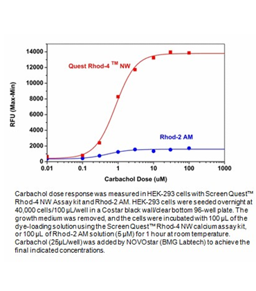Screen Quest检测试剂盒是一类用于检测各种细胞离子通道以及电位等系列工具,包括膜电位、钙离子流、多药物抗性、氯离子以及氯离子通道等方面的指标。每种检测方案均能提供不同的检测方案。这些高效的检测方案为从多角度研究细胞功能活动提供了一种十分有效的方法。钙流检测是药物研发中G蛋白偶联受体(GPCR)筛选的首选方法。Screen Quest Fluo-4 NW钙检测试剂盒提供了一种基于荧光测定的方法来检测细胞内钙离子流通量。表达GPCR的细胞,可使用我们独有的细胞膜通透性Fluo-4 NW来现实钙离子的定位,Fluo-4 NW是能用于高通量筛选中最明亮的钙离子指示剂。一旦进入细胞,Quest Rhod-4的亲脂性封闭基团在细胞非特异性酯酶的作用下分裂除去,在细胞中形成一种带负电荷的荧光染料,与钙离子结合时,其荧光强度显著增加。当细胞受到光谱扫描刺激时,受体信号释放细胞内钙离子,使Rhod-4的荧光显著地增强。长波长,高灵敏度和大于250倍倍的荧光增强(当与钙离子结合形成复合物时),这些特性使 Rhod-4成为一种检测细胞钙离子的理想指示剂。这个Screen Quest Rhod-4 NW钙离子检测试剂盒为监测G蛋白偶联受体(GPCRs)和钙离子通道提供了一个最佳检测方法。这种检测方法很可以很便捷地用于96或者384微孔板分析中,并且易于实现自动化。