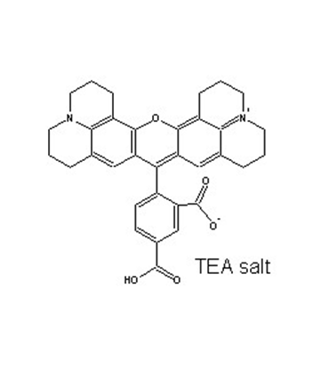 6-ROX是从5(6)-ROX纯化出来的单体。在一些复杂的生物学研究中,实验的重现性比材料耗费更加关键,它成为首选荧光标记试剂。5-ROX和6-ROX结构上只存在微小的差别,但会给所形成的共轭物生物学属性带来显著地影响。5-ROX主要被用于蛋白多肽的标记,而6-ROX主要被用于核苷酸和核酸的标记。现在,AAT Bioquest不需要使用传统的色谱纯化法,用自己专利技术合成了5-ROX单体。ROX不稳定,在存储期间要注意采取一些措施防止其降解。6-ROX[6-羧基-X-罗丹明] *单体*产品的光谱学相关参数为Ex=570nm / Em=591nm;其对应分子量大小为635.8MW。