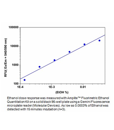 快速执行定量测定乙醇能力在生命科学研究,临床评估,生物或者药物产业中非常重要。这种无放射性乙醇实验是基于醇氧化酶氧化乙醇。Amplite乙醇定量检测试剂盒使用我们的Amplite HRP作为底物,这使该试剂盒具有双重数值阅读方式,既能使用荧光检测法(Ex/Em = 570nm/590 nm),也可以使用比色检测法读出(570 nm)。本试剂盒提供所有检测必须试剂和最佳检测方案。本检测法稳定、灵敏,可用于高通量筛选,在许多需要对乙醇进行检测的实验中。本检测法可以在30分钟内完成。
