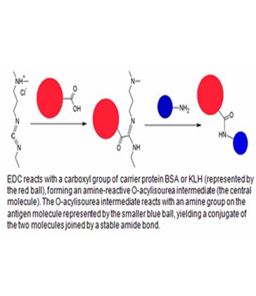 Keyhole Limpet Hemocyanin (KLH) is one of the most commonly used carriers in the conjugation of peptides for antibody production. Mariculture keyhole limpet hemocyanin (mcKLH) is a hemocyanin from the Concholepas concholepas mollusk with immunogenic properties similar to KLH but is more stable and efficient as a carrier protein for the production of antibodies to haptens and peptides. It contains numerous sites per molecule for effective conjugation of peptides and other antigens using amine-reactive or carboxyl-reactive crosslinkers. mcKLH is currently the industry standard for antibody production against a hapten or peptide. This ReadiLink™ KLH Conjugation kit is primarily optimized for the simple preparation of hapten-carrier conjugates for immunization and antibody production. The ReadiLink™ KLH Conjugation kit is one-step conjugation of a hapten to a carrier protein using the carboxyl-reactive carbodiimide as the crosslinker. The resulting conjugate is used for eliciting an immune response and antibody production against the hapten. The carboxyl-reactive carbodiimide reacts with exposed carboxyl and amino groups on peptides and proteins to form stable bonds. These kits contain mcKLH formulated in buffers compatible with the carboxyl-reactive carbodiimide reactions and desalt spin columns, which offer exceptional protein recovery by simple centrifugation step.