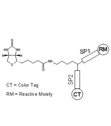 生物素广泛地用于标记生物分子,特别是标记抗体。生物素标记反应简单、温和且很少抑制抗体活性,生物素标记的抗体可存放多年而不失活。能与生物素结合的二级试剂为亲和素和链霉亲和素,所需的各种标记物均可购置。此外,亲和素和链霉亲和素的结合背景水平非常低.结合紧密且快速。故可消除多步骤程序中的许多缺点。蛋白质生物素化偶联试剂盒主要用于制备酶联免疫分析(EIA)中生物素标记的IgG。我们的试剂盒使用独有的ReadiView生物素琥珀酰亚胺酯(#3059)与IgG和其它生物分子的氨基基团反应。在此试剂盒中,我们的这种独特的生物素带有一个颜色标签,用于指示生物素化的程度,因此可以排除HABA生物素化检测的干扰。本试剂盒中含有所有用于标记和纯化的必须试剂,经过我们的实验显示,使用该试剂盒可使每个IgG分子耦联上5-8个生物素分子。