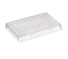 The Thermo Scientific 96-Well Full-Skirted Plates have a low-profile, thin well wall design and are compatible with PCR and qPCR applications. They feature an SBS footprint, and the plates are stackable for use in automated systems. These plates are available as SuperPlate, which are more rigid than standard plates, making it easier for robotic handling. The 96-Well Full-Skirted Plates feature a cut corner at the H1 location. These plates also have eight holes in the skirt, aiding in plate positioning and removal from the thermal cycler block. The full skirt surround provides an even surface for robotic arms to grip, making the plate suitable for use with automated systems.