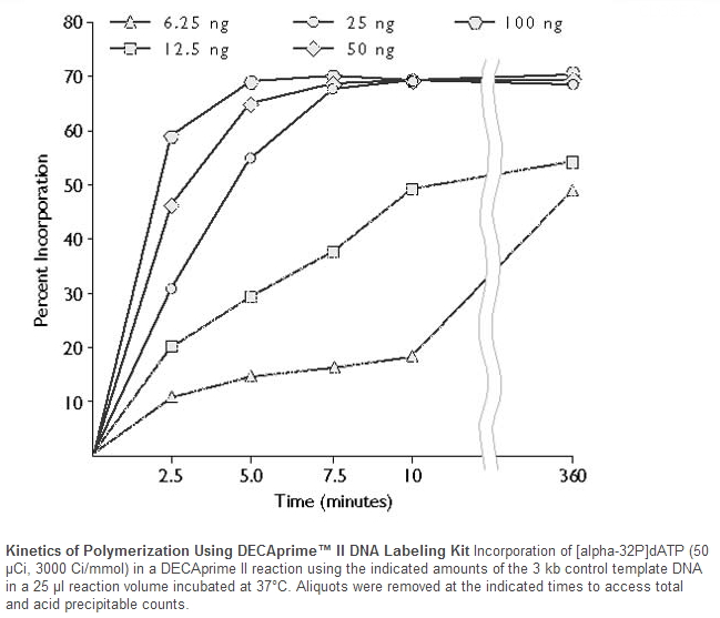 The Ambion® kit is for labeling DNA using a random-priming method, which has technical improvements over existing methods including the use of a high-purity, exonuclease-free Klenow and Random Decamers to produce probes with greater than 109 cpm/µg in 10 min reactions. The kit includes sufficient reagents for 30 reactions.